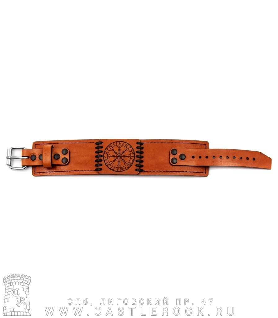 Браслет кожаный с гравировкой Агисхьяльм Шлем Ужаса в Руническом Круге