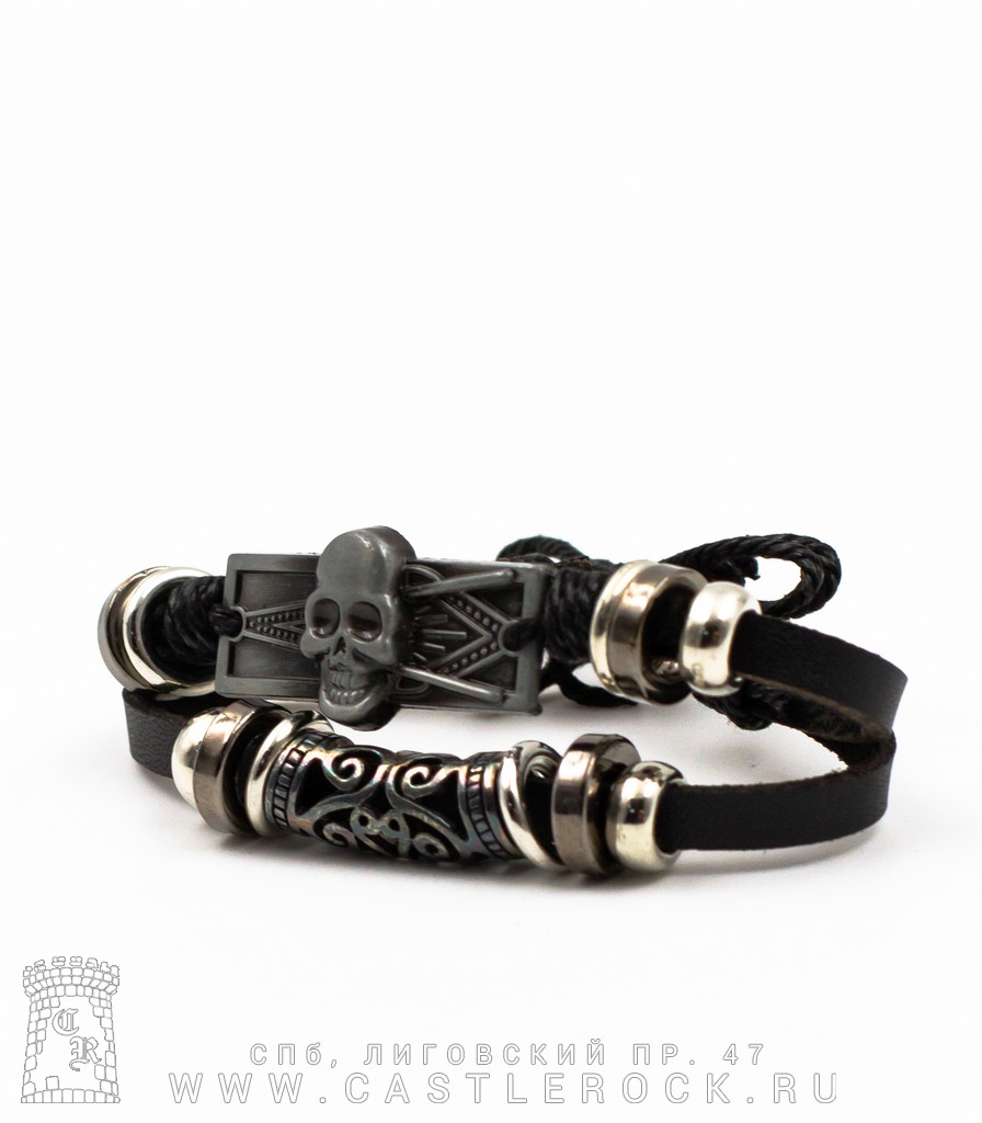 Фенечка кожаная Череп (бусины, черная)