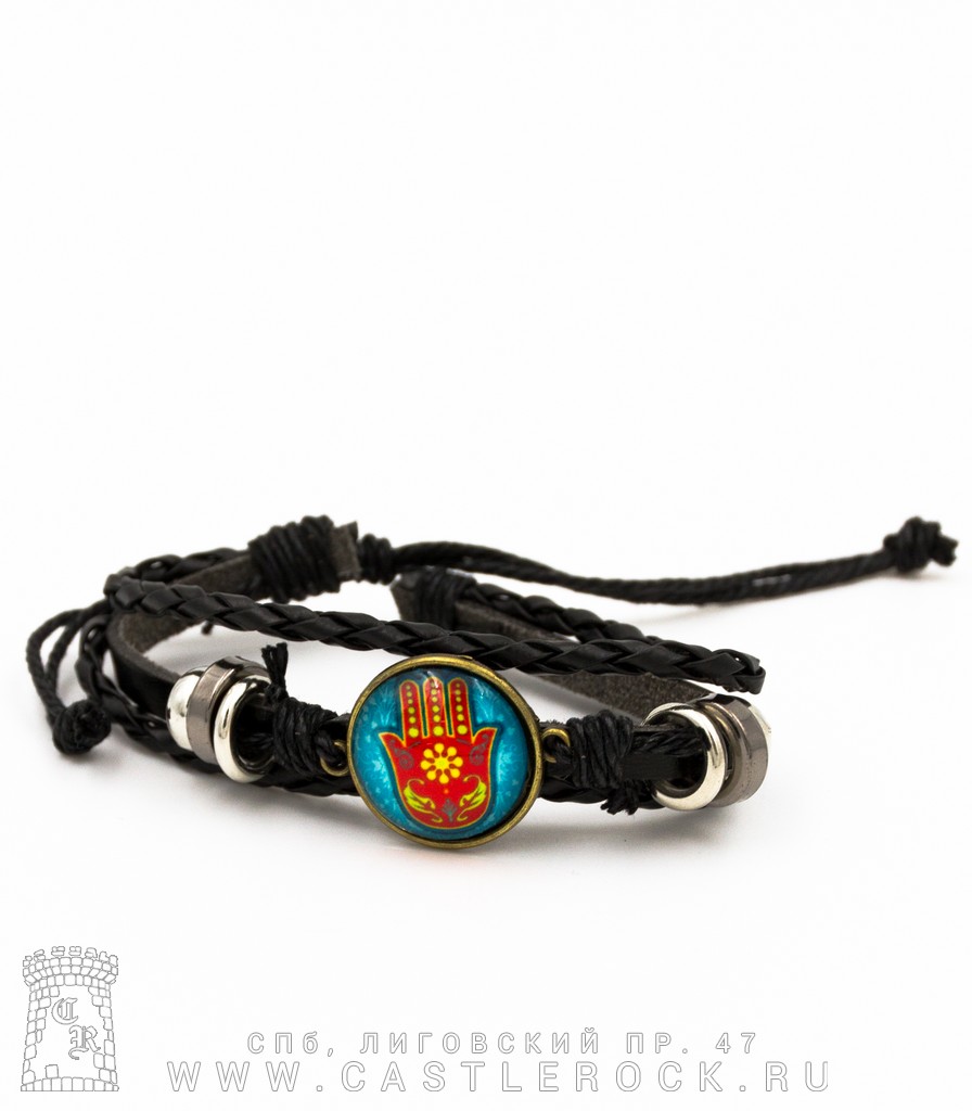 Фенечка кожаная Кабошон Хамса (ладонь красная, голубой фон, черная)