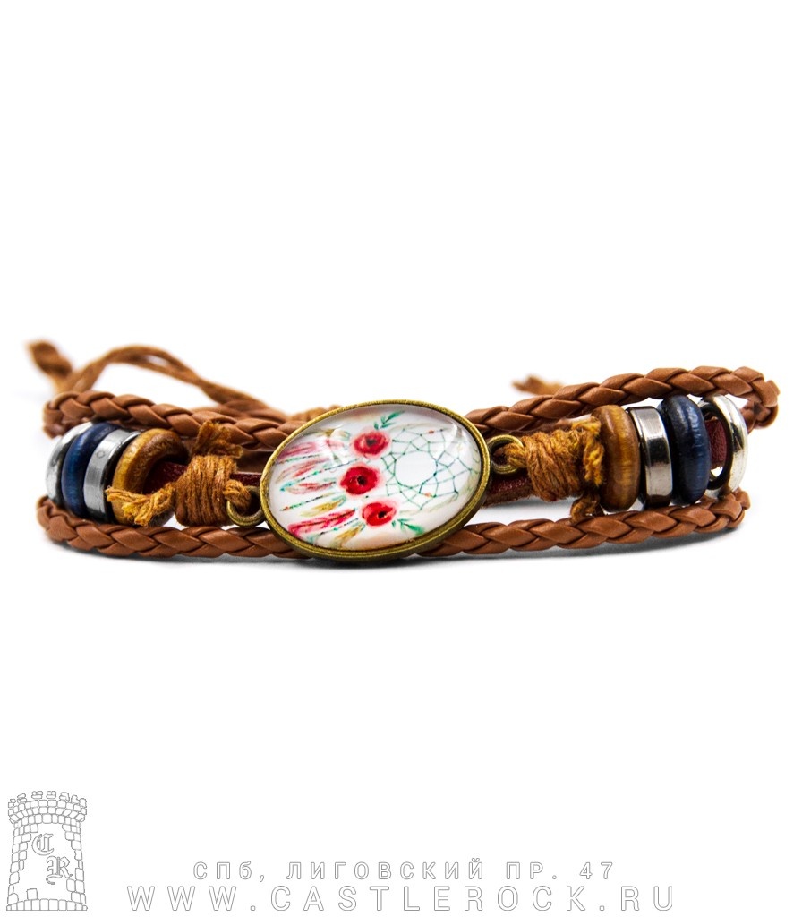 Фенечка кожаная Кабошон Ловец Снов (овал, цветы, коричневая светлая)