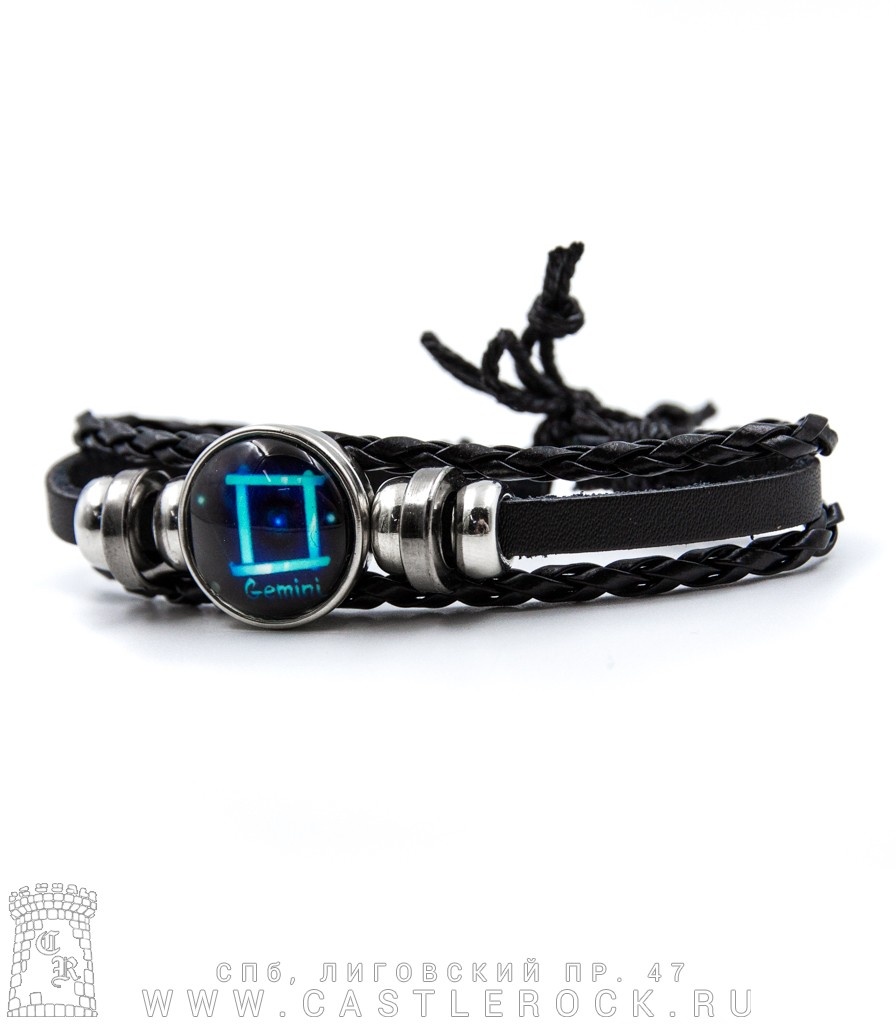 Фенечка кожаная Кабошон Знак Зодиака Близнецы (голубой)