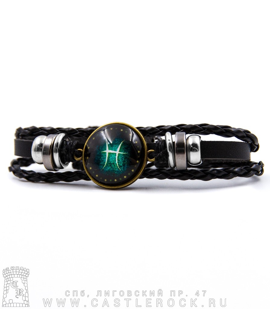 Фенечка кожаная Кабошон Знак Зодиака Рыбы (зеленый)