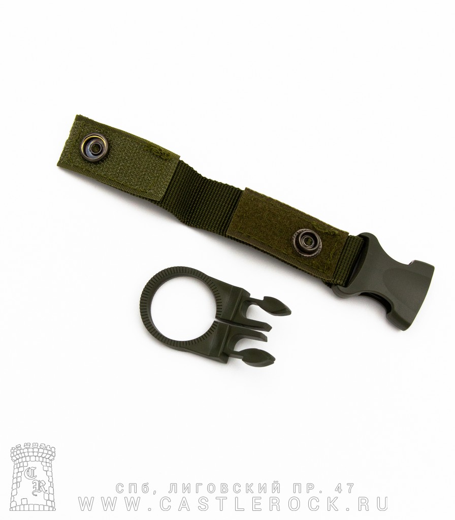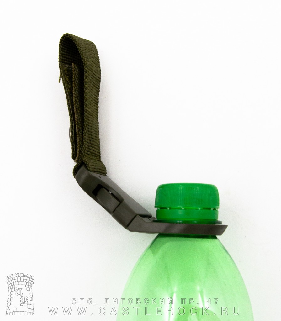 Пластиковое кольцо держателя крепится на горлышко бутылки, крепление из тесьмы фиксируется на поясе.