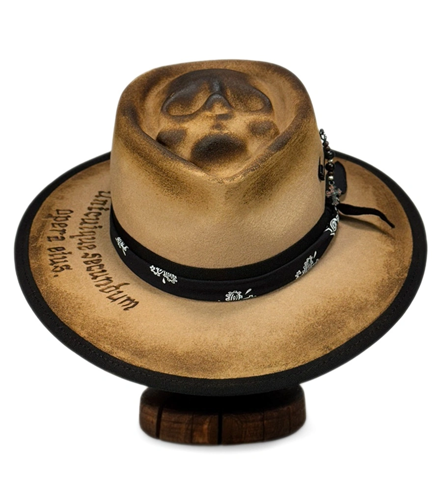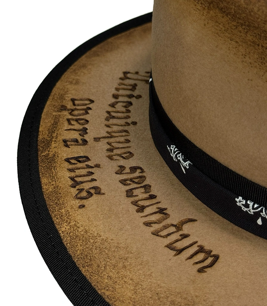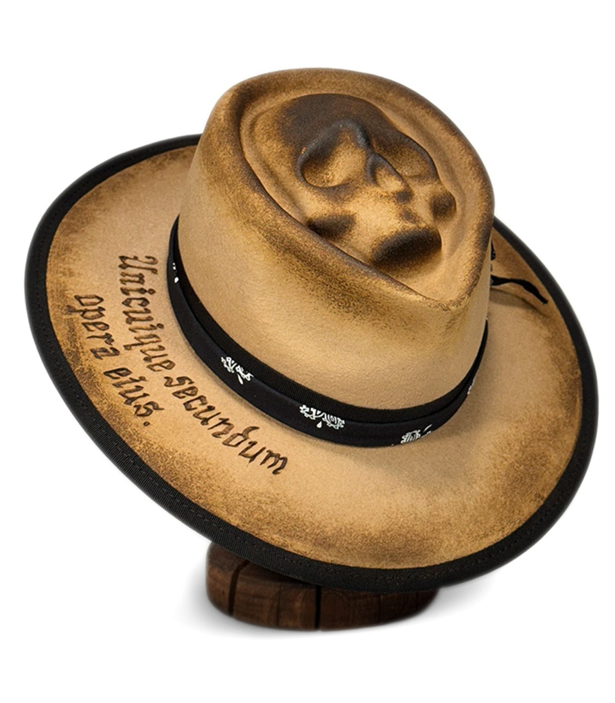 Оригинальная фетровая шляпа ручной работы бежевого цвета с обжигом и вощением. Тулья декорирована репсовой лентой, банданой, подвеской с бусинами и крестиком, в верхней части рельеф в виде черепа. Надпись на полях "Unicuique secundum opera eius" (Да воздастся каждому по делам его) выполнена в технике выжигания.