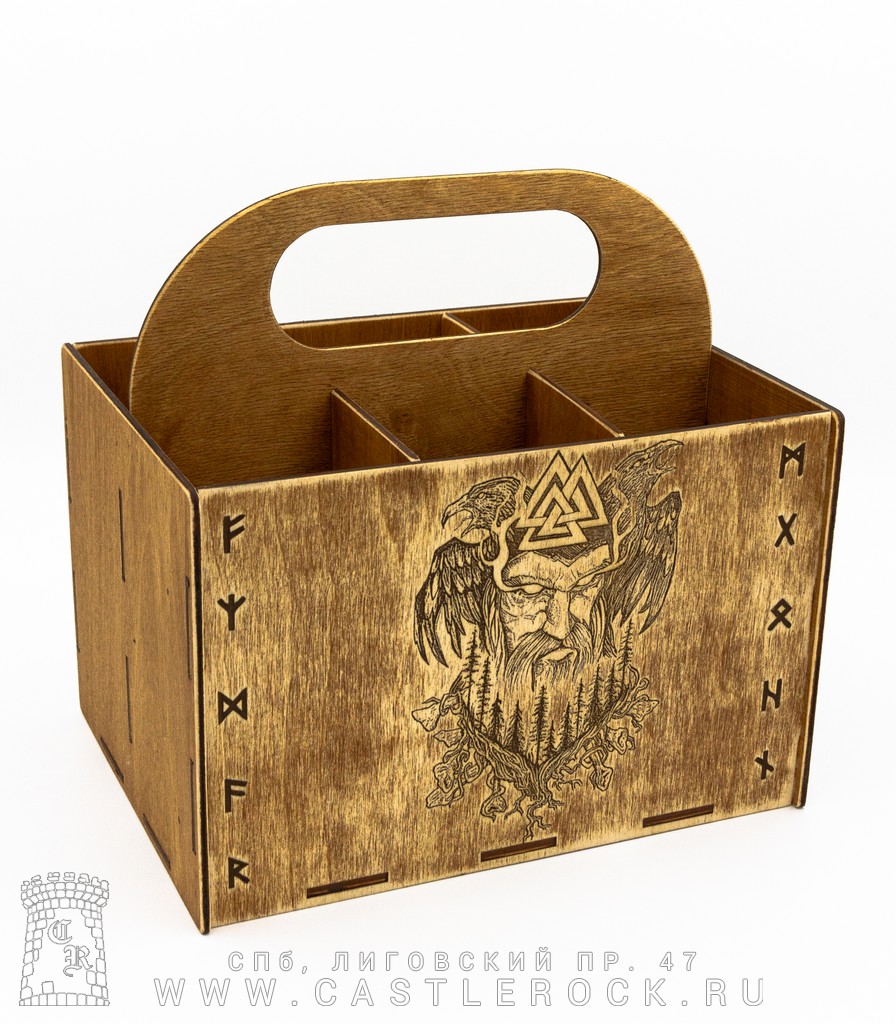 Переноска для бутылок и банок. Изготовлена из полированной фанеры толщиной 3 мм. Рисунок нанесен методом лазерной гравировки.