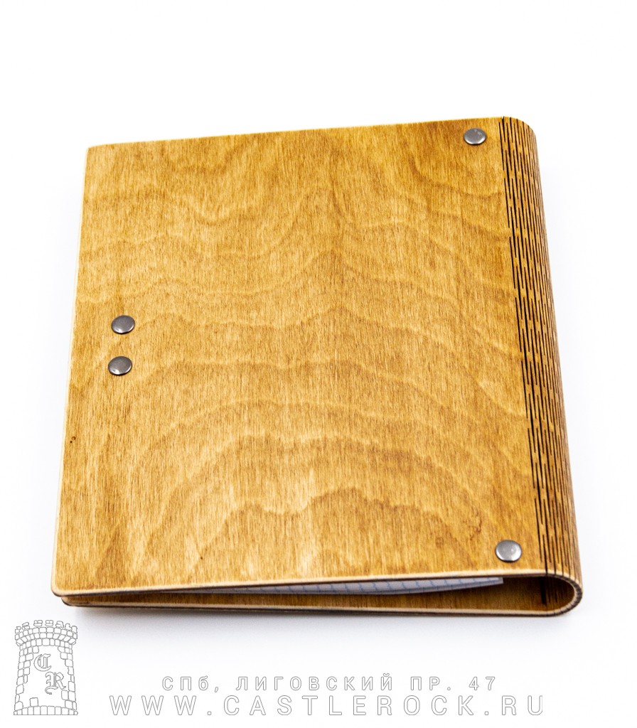 Обложка - полированная фанера толщиной 3 мм. Блок страниц - сменный. Формат страниц - А5. Рисунок на обложке нанесен методом лазерной гравировки.