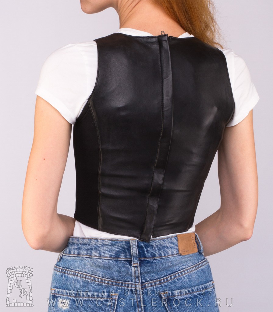 Корсет выполнен из высококачественной натуральной овечьей кожи. По бокам вставки из эластичного материала. С декоративной шнуровкой и перфорированной вставкой спереди и молнией сзади.