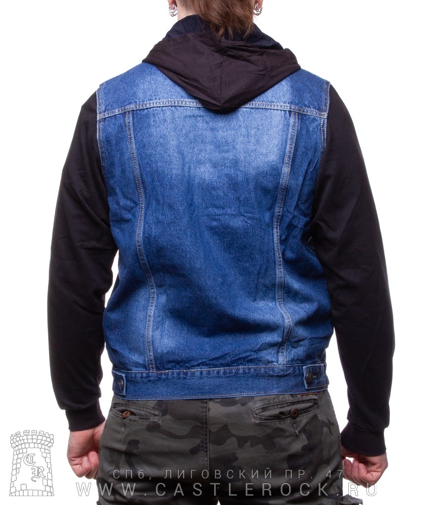 Джинсовая куртка с рукавами и капюшоном из трикотажа.