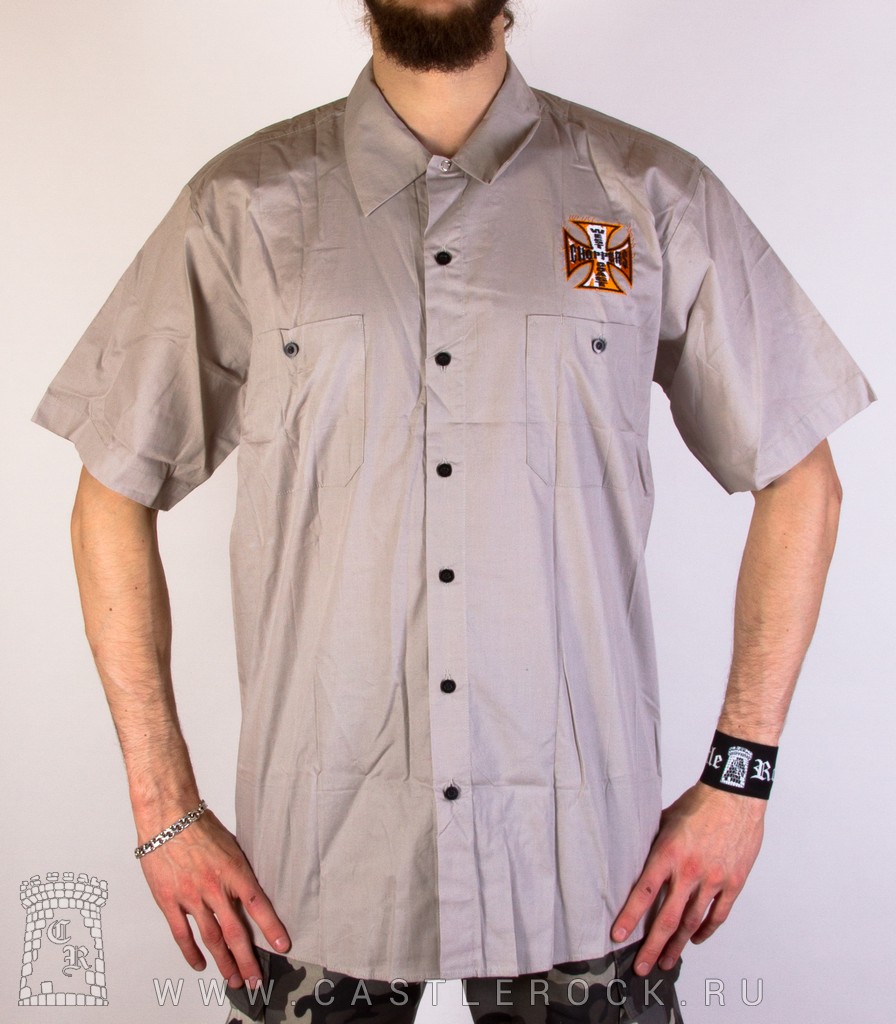 Рубашка с коротким рукавом West Coast Choppers (огонь, байк с зеленым рисунком, светло-серая)
