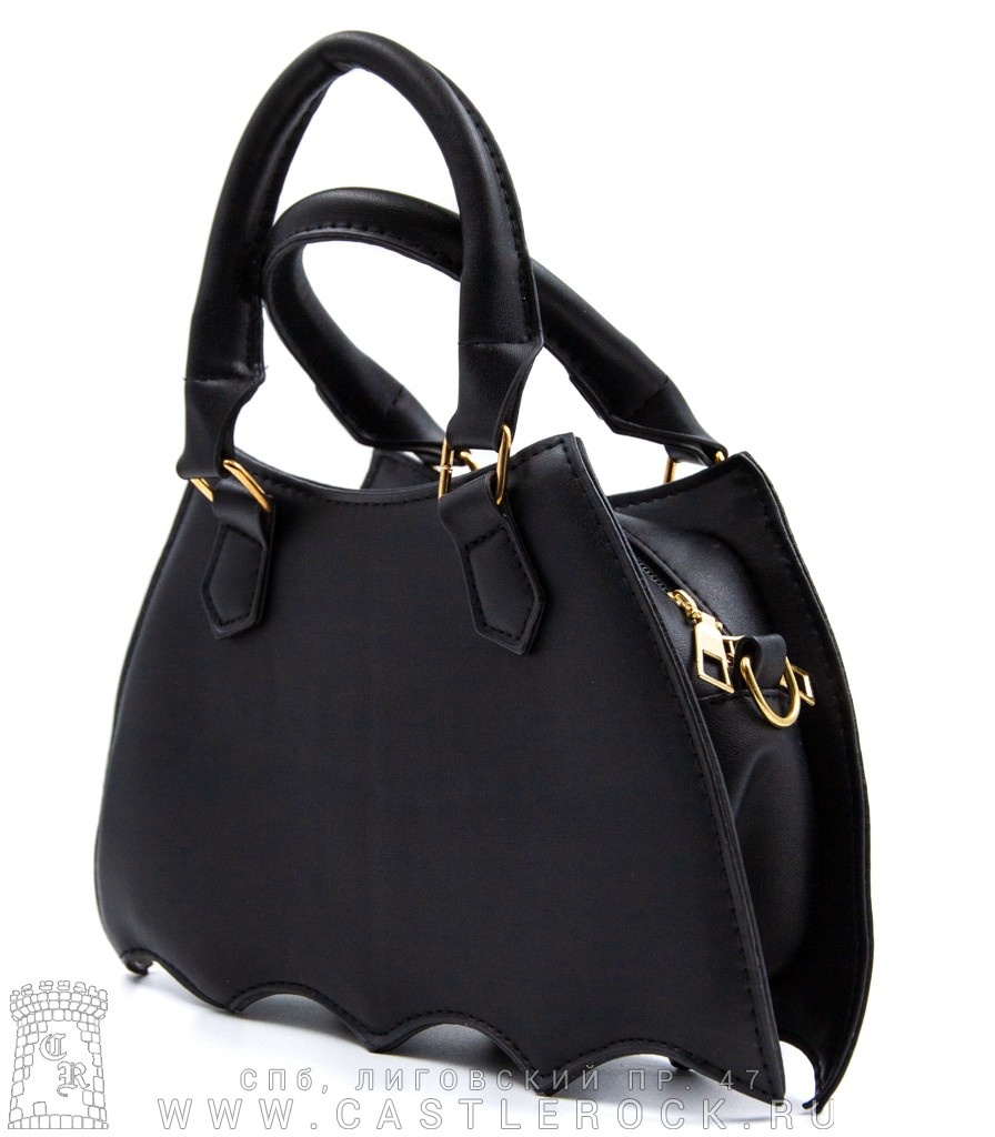 Оригинальная сумка в виде крыльев летучей мыши. Одно большое отделение на молнии, две короткие ручки, регулируемый ремень на карабинах для ношения сумки на плече.
