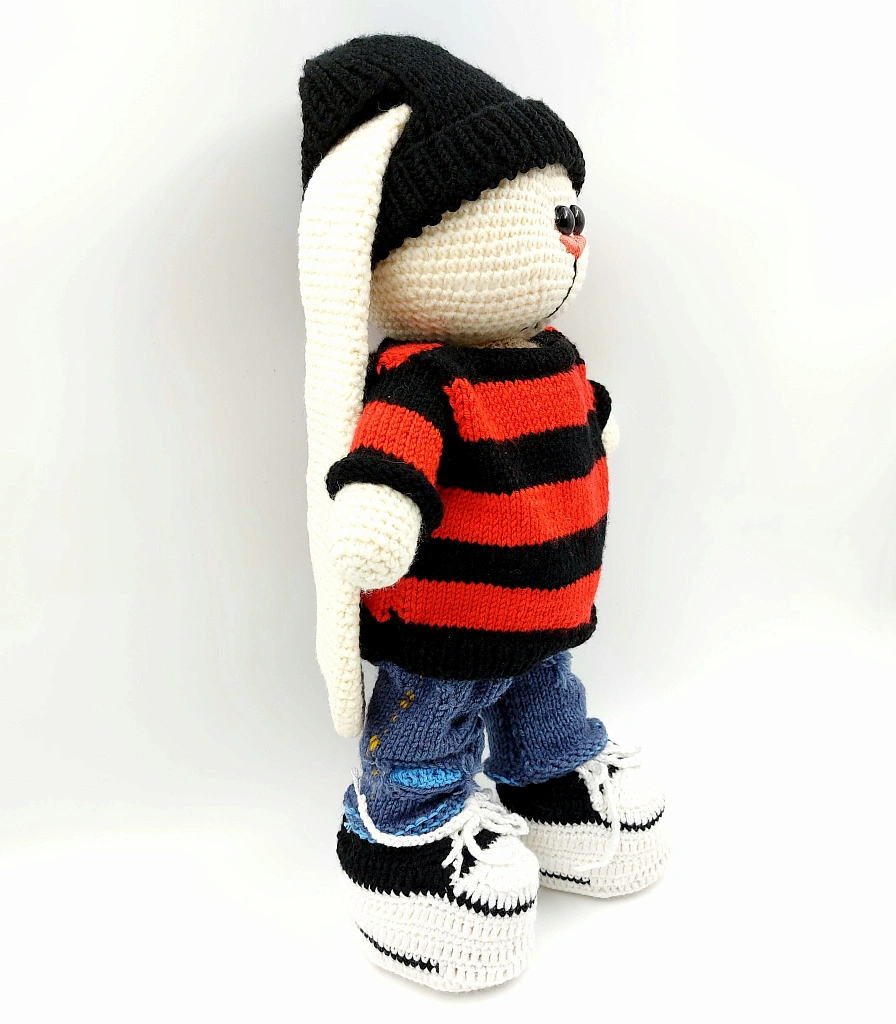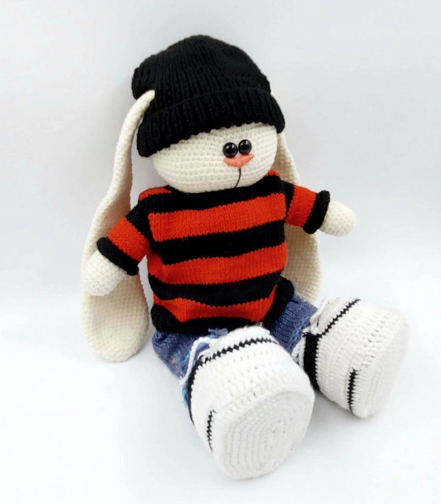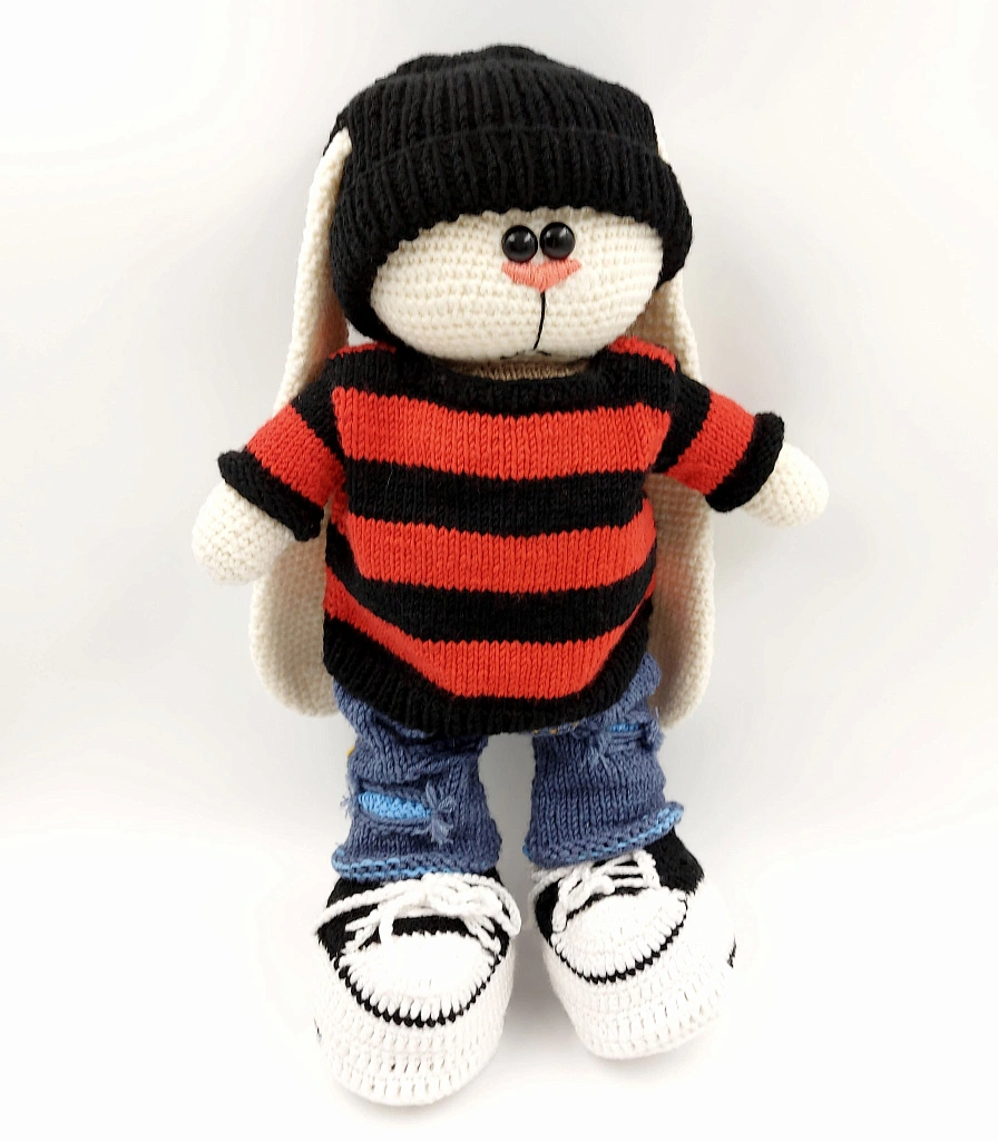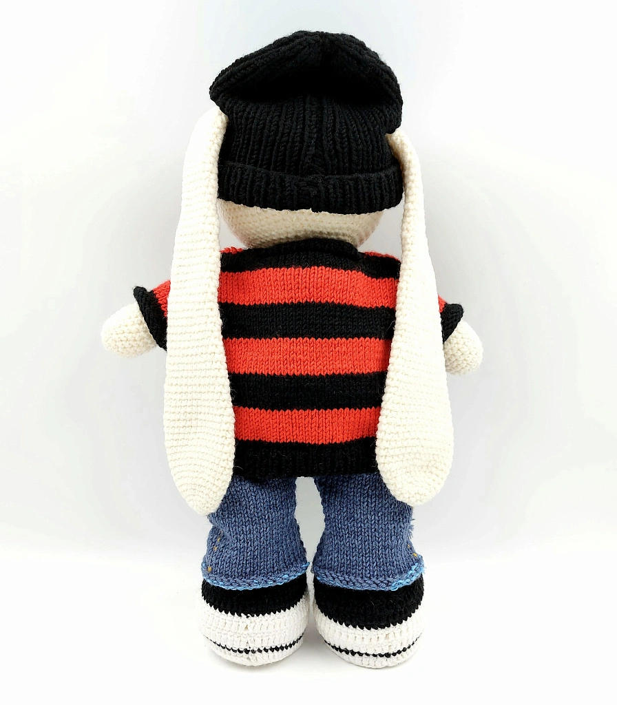 Вязаная набивная игрушка ручной работы. Каждый предмет одежды связан отдельно, при необходимости обувь и шапочку можно снять.