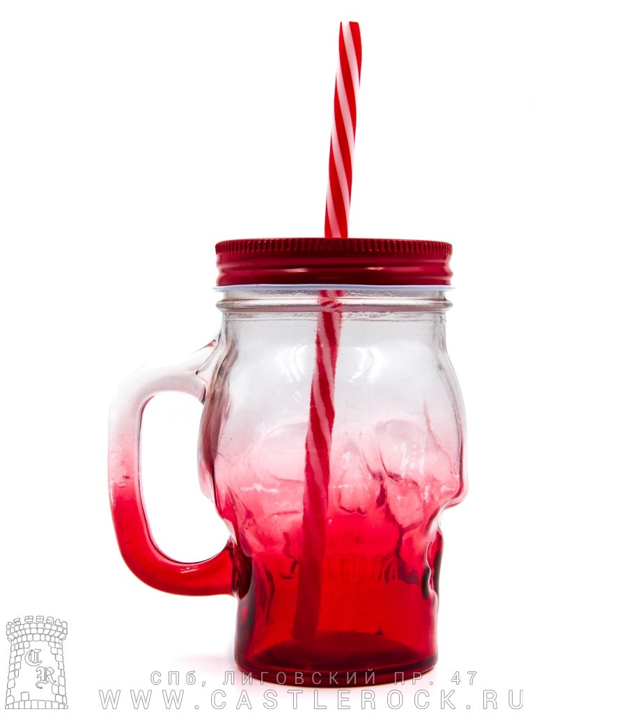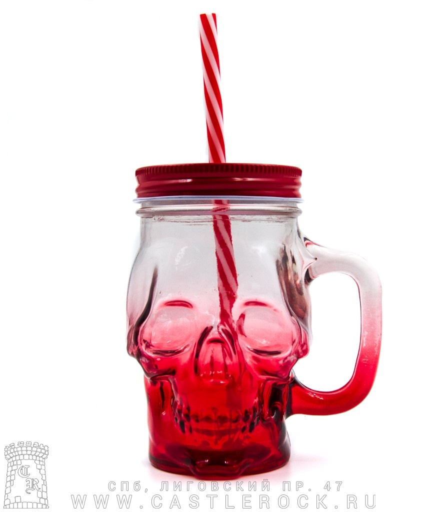 Кружка стеклянная Череп (с крышкой, красная)