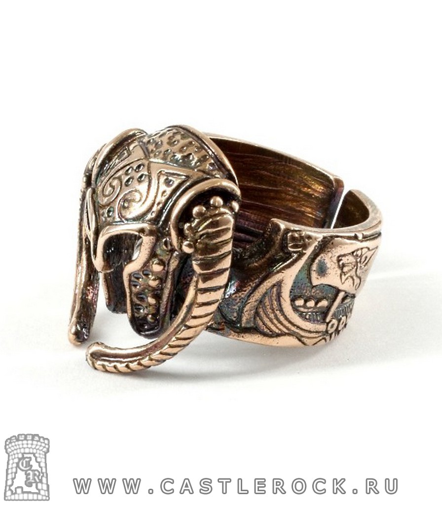 Разъемное кольцо в форме древнего нордского шлема с рогами и оригинальной художественной шинкой с рисунком корабля Викингов Драккаром и флагом с изображением волка. Стилизованное кольцо выполнено по игре Скайрим.