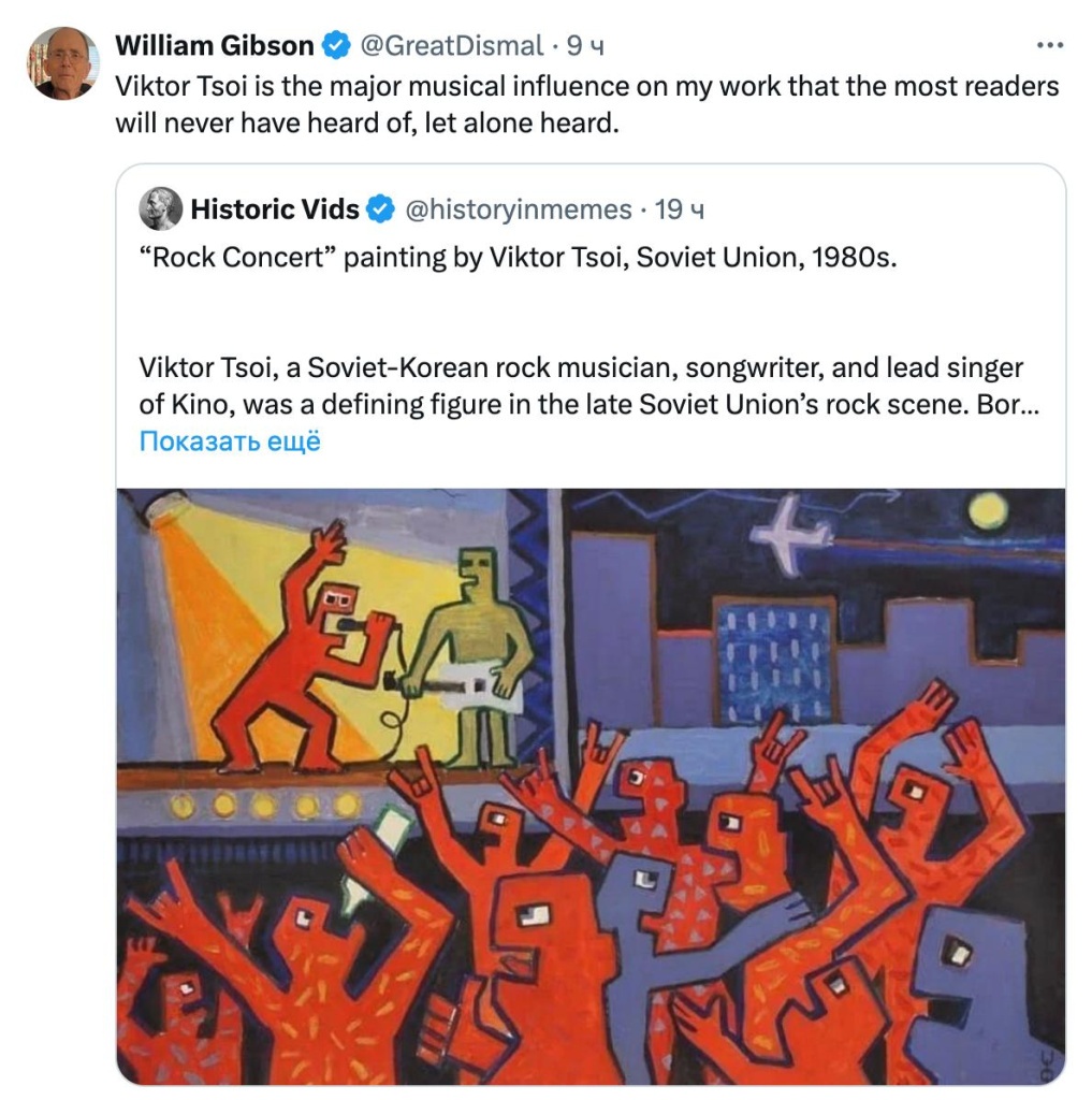 Но сейчас нам интересны не его литературные произведения, а увлечение Гибсона творчеством Виктора Цоя, на которое он обратил внимание в конце восьмидесятых, и даже писал сценарий фильма с Цоем в главной роли. Увы, авария и гибель Виктора нарушили эти планы.