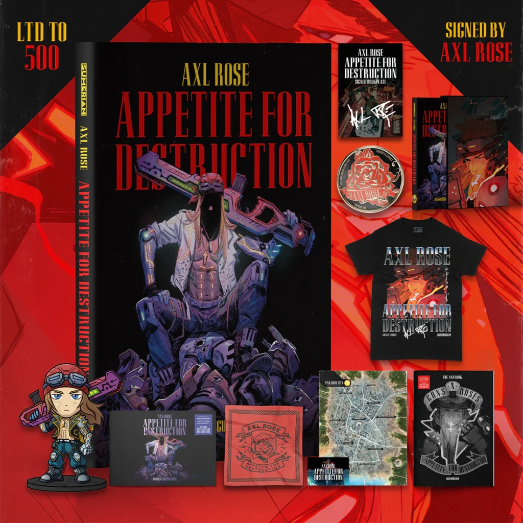 Процитирую одного из учредителей издательства Sumerian Comics, в котором выйдет книга: “"Axl Rose: Appetite for Destruction" – это необузданная мечта в стиле неонового нуара, отчасти рок-гимн, отчасти киберпанковское пророчество. Мы с Экслом построили мир, в котором бунтарство – это не просто позиция, это выживание”.