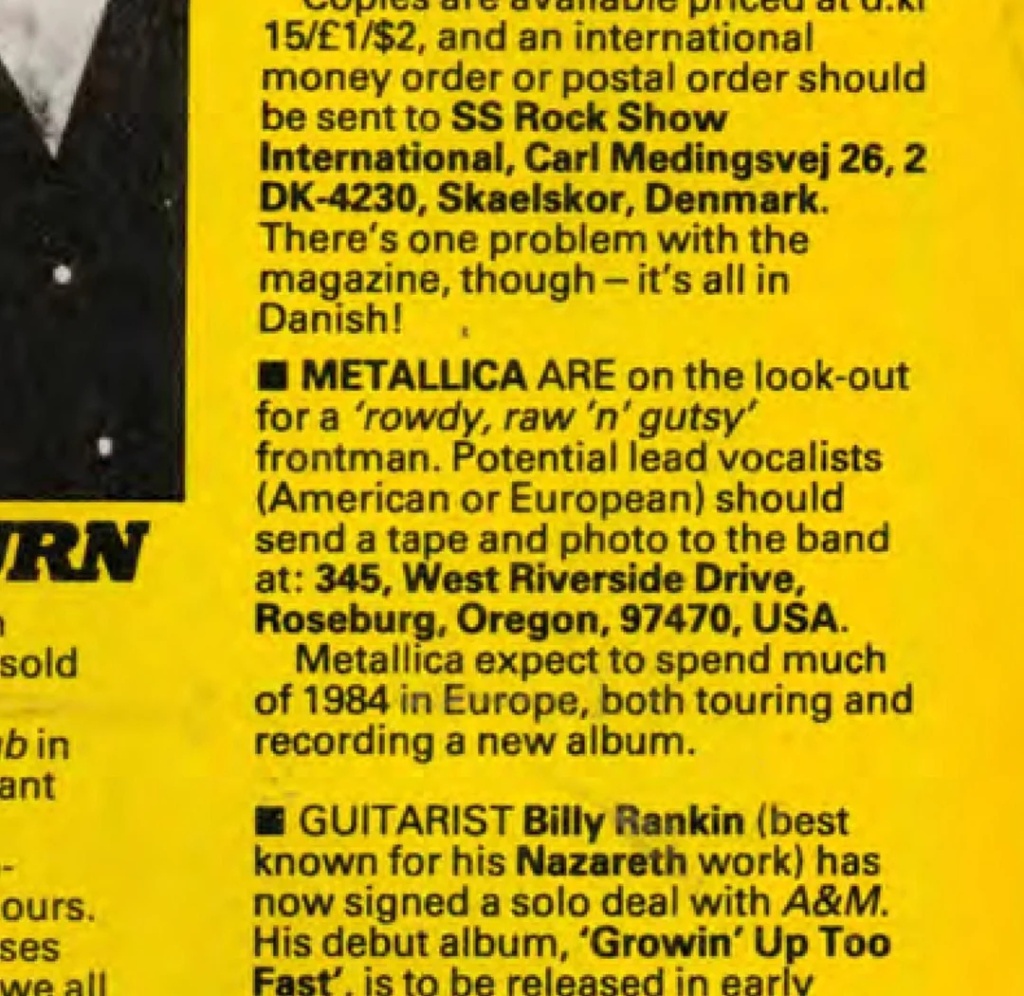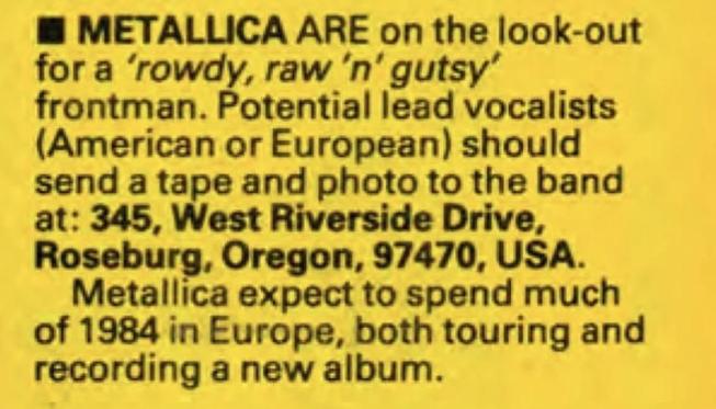 Объявление появилось в британском журнале “Kerrang!” 29 декабря 1983 года. Текст был лаконичен: группа искала "грубого, буйного и дерзкого" вокалиста. Требования звучали жестко, но справедливо — Metallica уже была на пороге мировой славы, и компромиссы здесь были неуместны. Потенциальный ведущий вокалист (американец или европеец) должен был прислать кассету и фотографию по адресу в городе Роузбург, где жил Кей Джей Доутон — друг группы и руководитель первого фан‑клуба Металлики.